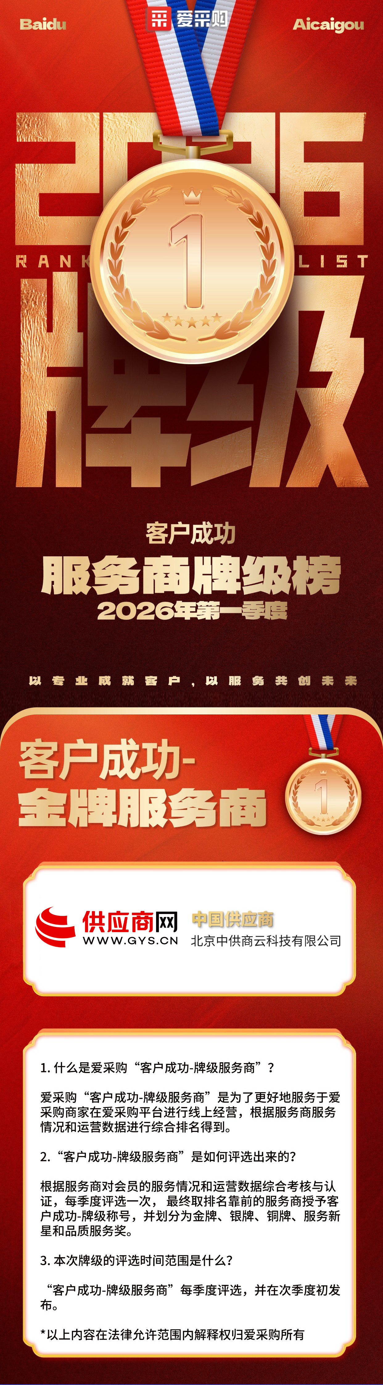 在剛剛揭曉的2026年第一季度【客戶成功-服務(wù)商牌級(jí)榜】中,供應(yīng)商網(wǎng)(www.zhongjunboyan.cn)憑借卓越服務(wù)與客戶滿意度,再次斬獲“客戶成功-金牌服務(wù)商”最高榮譽(yù),繼續(xù)穩(wěn)居行業(yè)標(biāo)桿,彰顯長期領(lǐng)先實(shí)力!